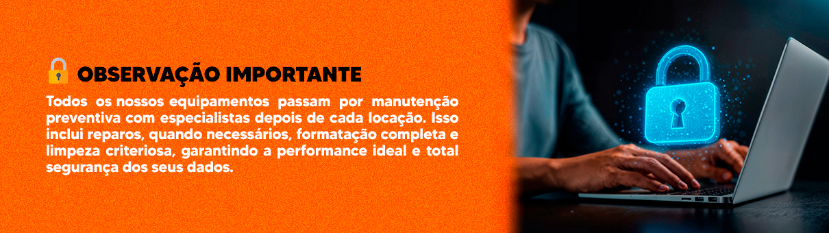 O tempo mínimo de locação é de 1 mês, mas também oferecemos opções de contratos curtos e de longo prazo, conforme a sua necessidade. Assim, você pode alugar o equipamento pelo período exato que precisar, seja para um projeto curto, um curso, eventos ou uso contínuo.
